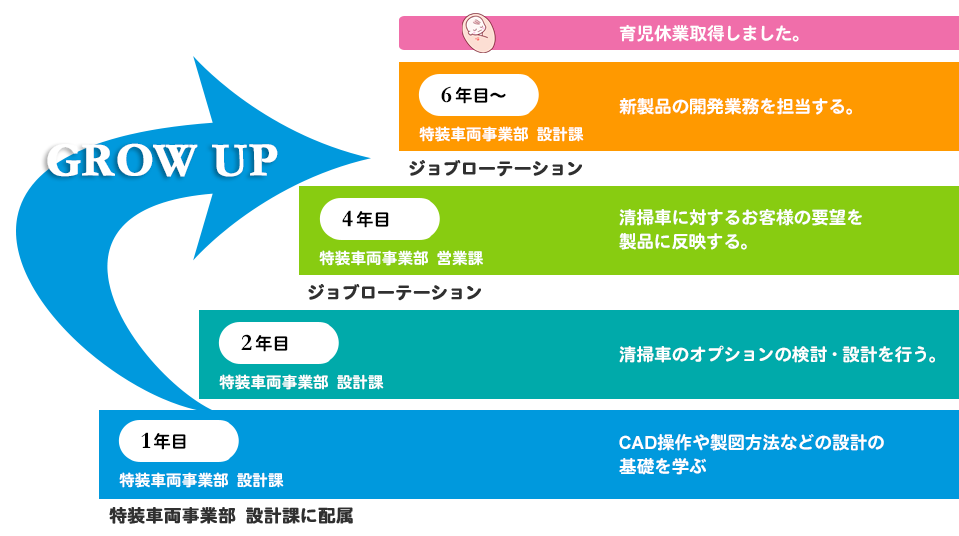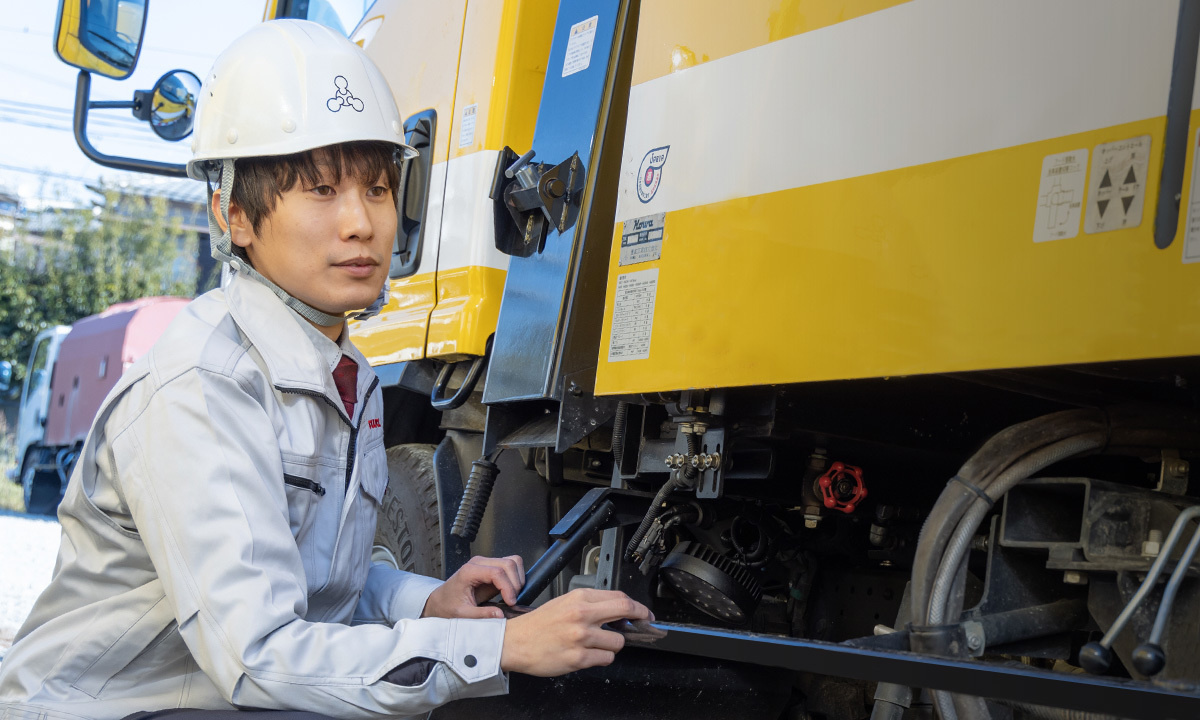 特装車両事業部設計課にてブラシ式路面清掃車の開発設計業務を行っています。清掃車はお客様からさまざまなご要望があり、それを実際に反映させながら設計を行うことは大変ではありますが、自分が開発や設計をしたものが製品としてでき上がるまで確認できるので、そこに大きなやりがいを感じます。また、私は入社後は設計課に配属されましたが、その後のジョブローテーションで営業課へ異動となりました。お客様により近い場所で仕事をすること、ニーズを直接的に知る機会を得ることができたことは、今でも貴重な体験となっています。若いうちからさまざまな経験を積むことができるのは、豊和工業ならではの強みだと思います。現在は設計課に戻って業務を行っています。今後の目標は路面清掃車のICT化を行うことで、少しでもオペレータの方の負担を軽減できるよう取り組んでいきます。
