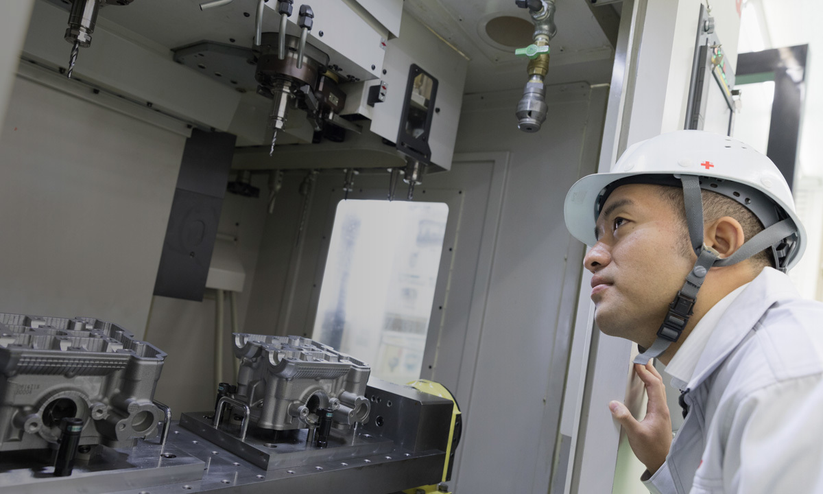 現在は、機械事業部工作機械GR設計チームで工作機械の外装カバーや特殊仕様の工具の設計、構造解析のような要素技術を担当しています。入社当時は、機器GR設計チームでお客様のご要望に合わせた特殊仕様のチャックや回転シリンダの設計業務に加えて、消耗品やリピート品の手配なども行っていました。設計チームに配属された当初は、基本的な知識も進め方も分からず、周りの先輩社員や上司に相談しながら何とか業務をこなす日々でした。しかし、いつでも相談に乗ってもらえる職場環境に加えて、ベテラン社員の方に毎週勉強会を開催していただけたことで、随分成長することができました。これまでに設計してきたモノは大小さまざまですが、図面通りにできた完成品を見たときは責任が大きい分だけやりがいを感じています。現在は部下を指導する立場となり、私自身、経験してきた技術を後進へ引き継ぎ、チームとして世の中に影響を与える機械を設計したいと思っています。