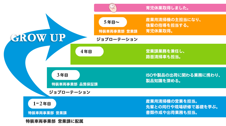 現在、道路の清掃に用いられる路面清掃車と工場やレジャー施設の清掃に用いられる産業用清掃機の営業を担当しています。お客様への営業活動をはじめ、仕様の打合せや、受注から出荷までの日程計画及び社内展開、展示会での説明員など様々な業務を行っています。入社当初は、文系出身と言うこともあり、機械の知識が乏しく、お客様への説明・PRが上手くできませんでした。報連相をしっかり行い、先輩や上司からフォローや指導いただき、少しずつ製品知識を深めていくことができ、ものづくりの幅が広がりました。