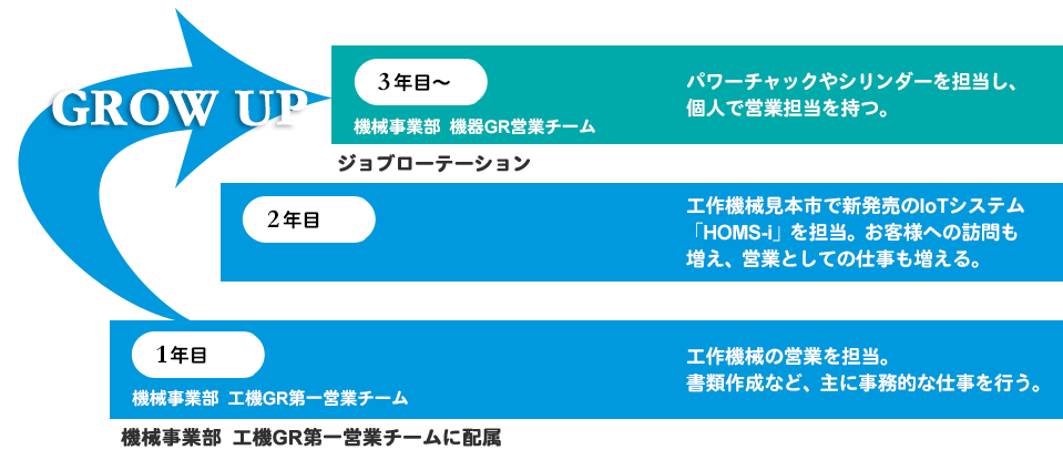 自社製品である専用パワーチャックやシリンダーの営業担当をしています。機器チームの営業としてお客様を訪問し、自社製品の販促活動を中心に見積対応や電話対応、メール対応などを行っています。入社後に配属された工作機械営業チームでは、商談規模が大きい案件が多く、入社間もないこともありアシスタント業務が中心でしたが、現在は個人で営業担当を持ち、OJTで付いてくださる先輩に助けて頂きながら多くの案件に携わっています。