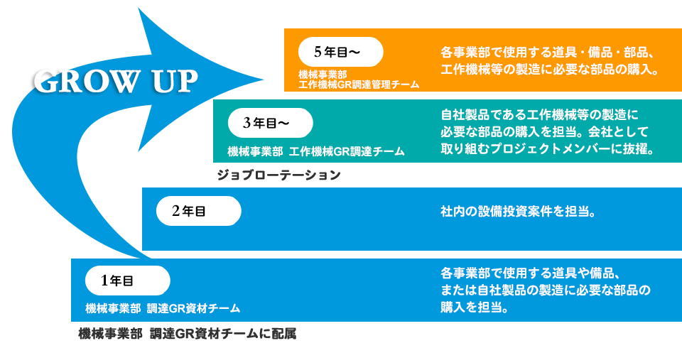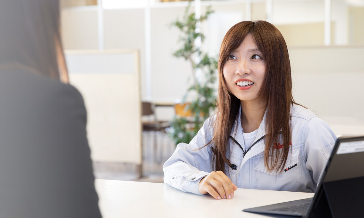 入社当時は、資材チームに配属となり各事業部で使用する道具や備品、また自社製品の製作に必要な部品の購入を行いました。その後、ジョブローテーションで調達チームに配属となり機械事業部に特化した部署で自社製品である工作機械等の製造に必要な部品の購入を行いました。現在は、調達管理チームに所属し今まで経験した両方の業務を担当しています。仕入先の選定から始まり、価格や納期についての交渉をしながら、高品質・高性能な製品をできる限りお値打ちに・短納期で仕入れます。小さな部品から機械のような大きなものまでありますが、いずれも原価のコストダウンにより会社に利益をもたらすことが重要な仕事となります。