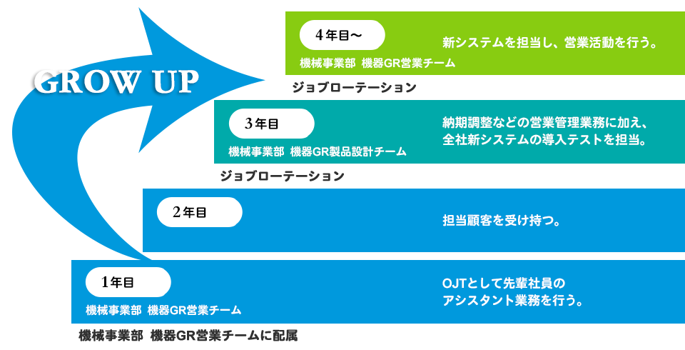 入社後、機器製品の営業チームに配属となり、営業職として主に見積業務や客先対応を担当しました。3年目からは製品設計チームへジョブローテーションをし、製品の図面の読解や部品の原価計算、納期調整などの業務を通して、知識を習得しました。また、全社新システムの導入を担当しました。現在は、営業チームに戻り、引き続き社内システムを担当し、並行して営業活動を行っています。